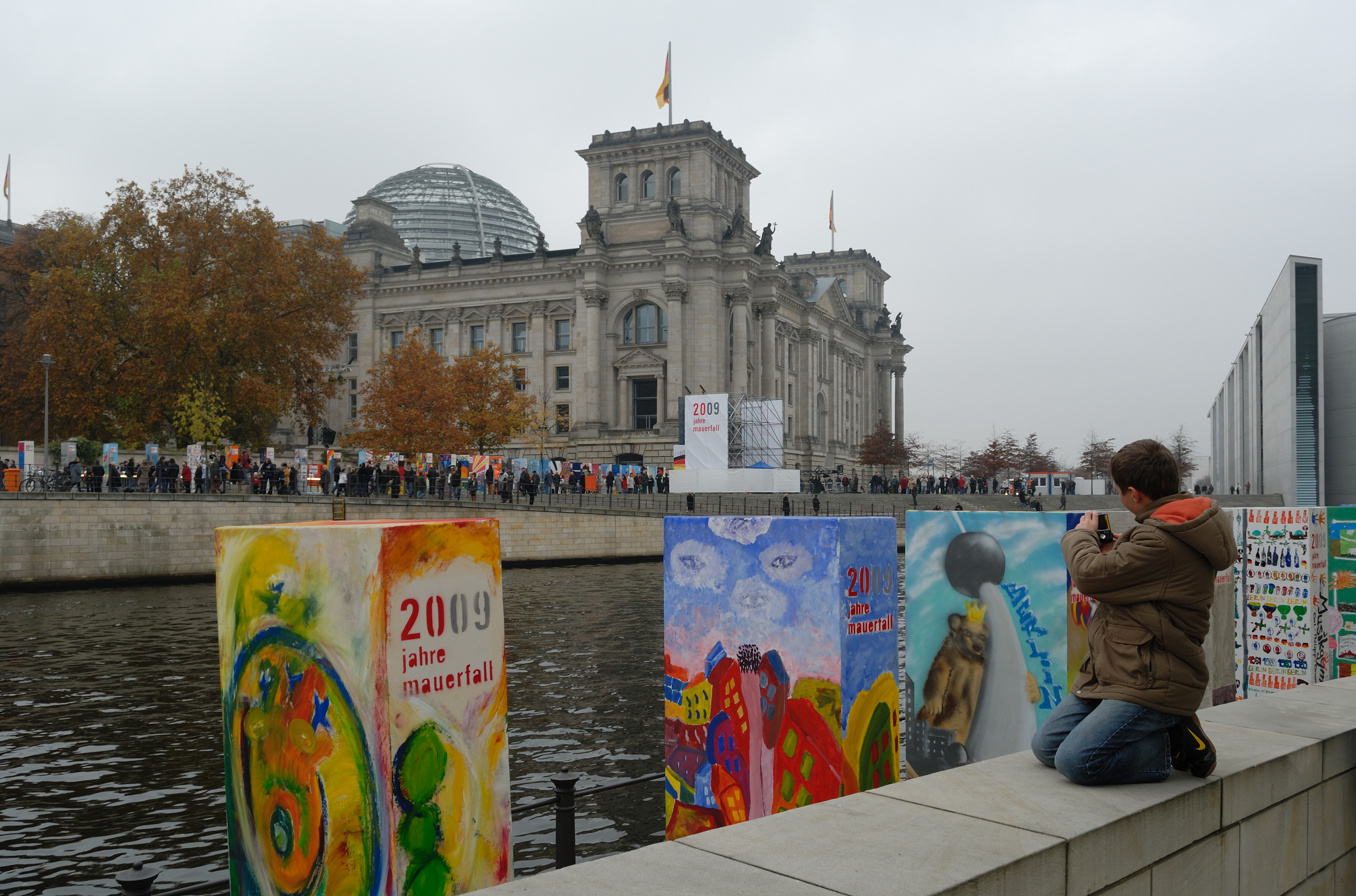 Dominoaktion zum 20. Jahrestag des Mauerfalls in Berlin: Freiwillige bemalten tausende Dominosteine, die symbolisch am 9.11.2009 fielen, © Jochen Teufel, 20 Jahre Mauerfall (2009), CC BY-SA 3.0